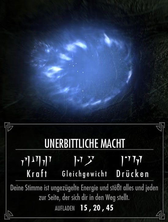 Einige Worte werden dem Spieler auch von den Graubärten beigebracht. Je mehr Worte bei einem Schrei ausgesprochen werden, desto mächtiger ist dieser. Um jedoch die Schreie verwenden zu können, müssen die Worte der Macht zuerst erlernt werden, indem der Spieler Seelen von besiegten Drachen nutzt oder die Graubärte ihr Verständnis des Schreis mit dem Spieler teilen. Die Seelen werden automatisch von besiegten Drachen absorbiert und können dann zum Erlernen der Worte der Macht verwendet werden. Es gilt das Prinzip: eine Seele pro Wort. Die Seele selbst spendet hierbei das Wissen um das zu erlernende Wort. Die erlernten Schreie werden in der Drachensprache ausgesprochen, weswegen sie überhaupt erst eine besondere Kraft entfalten. Auch die Drachen selbst verwenden sie; für sie gibt es daher keinen Unterschied zwischen einem Wortgefecht und einem physischen Kampf.