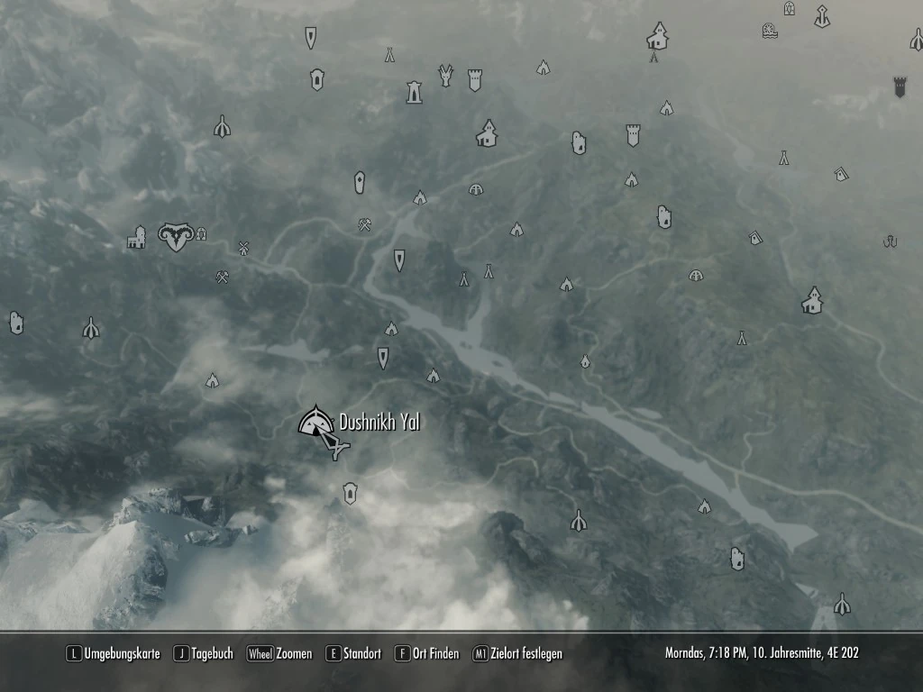 Dushnikh Yal liegt im Fürstentum Reach, südöstlich von Markarth, östlich der Reinwasserpassage, westlich von Valthume und nordwestlich von Arkngthamz (DG).