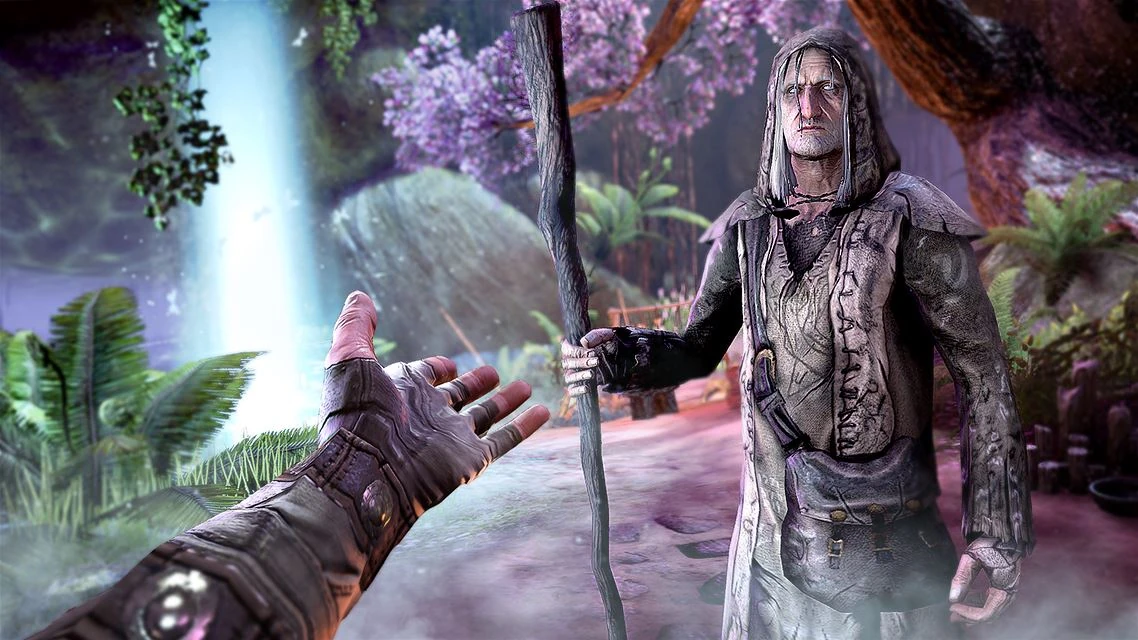 "Das Portal des dunklen Ankers befindet sich weit über uns. Ich werde einen Zauber vorbereiten, um uns hinaufzuheben. Aber zunächst müsst Ihr Euch auf Nirn einstimmen, um Eure physische Form zurückzuerlangen, hierfür werdet Ihr eine Himmelsscherbe benötigen."