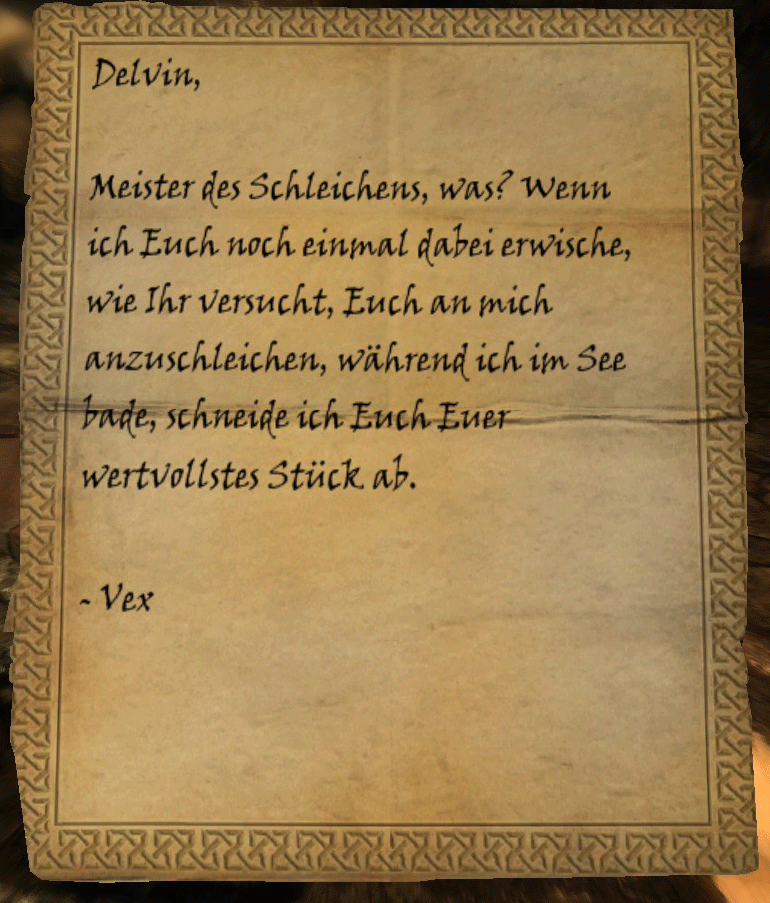 - Auf einem der Tavernentische findet man - neben diversen Nachrichten - einen Zettel namens Eine Warnung von Vex an Delvin (siehe Bild).
