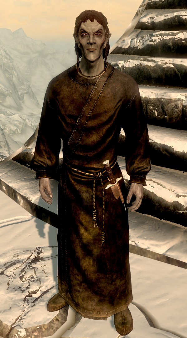 Este dunmer está realizando un peregrinaje a la capilla de Azura situada al sur de la ciudad de Hibernalia. Si el Dovahkiin le pregunta sobre la localización exacta de esta capilla, Faldrus la marcará en su mapa.