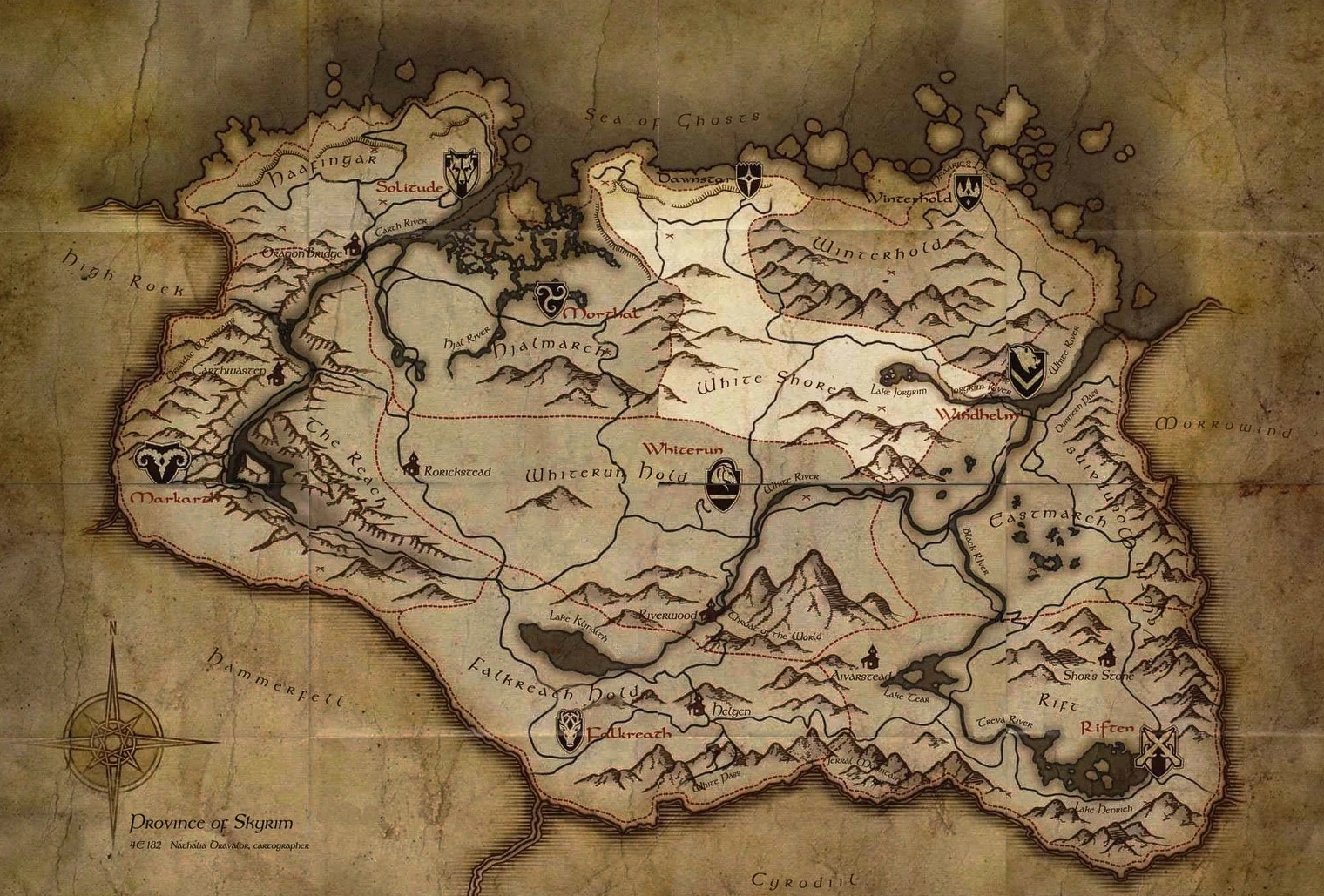 Il feudo è un territorio montuoso perennemente innevato con diverse foreste. Sono presenti quattro caverne, quattro accampamenti di giganti, delle antiche rovine Nord, Forte Dunstad e il Santuario di Mehrunes Dagon. Nella città di Dawnstar è presente il Museo della Mitica Alba, gestito da Silus Vesuius.