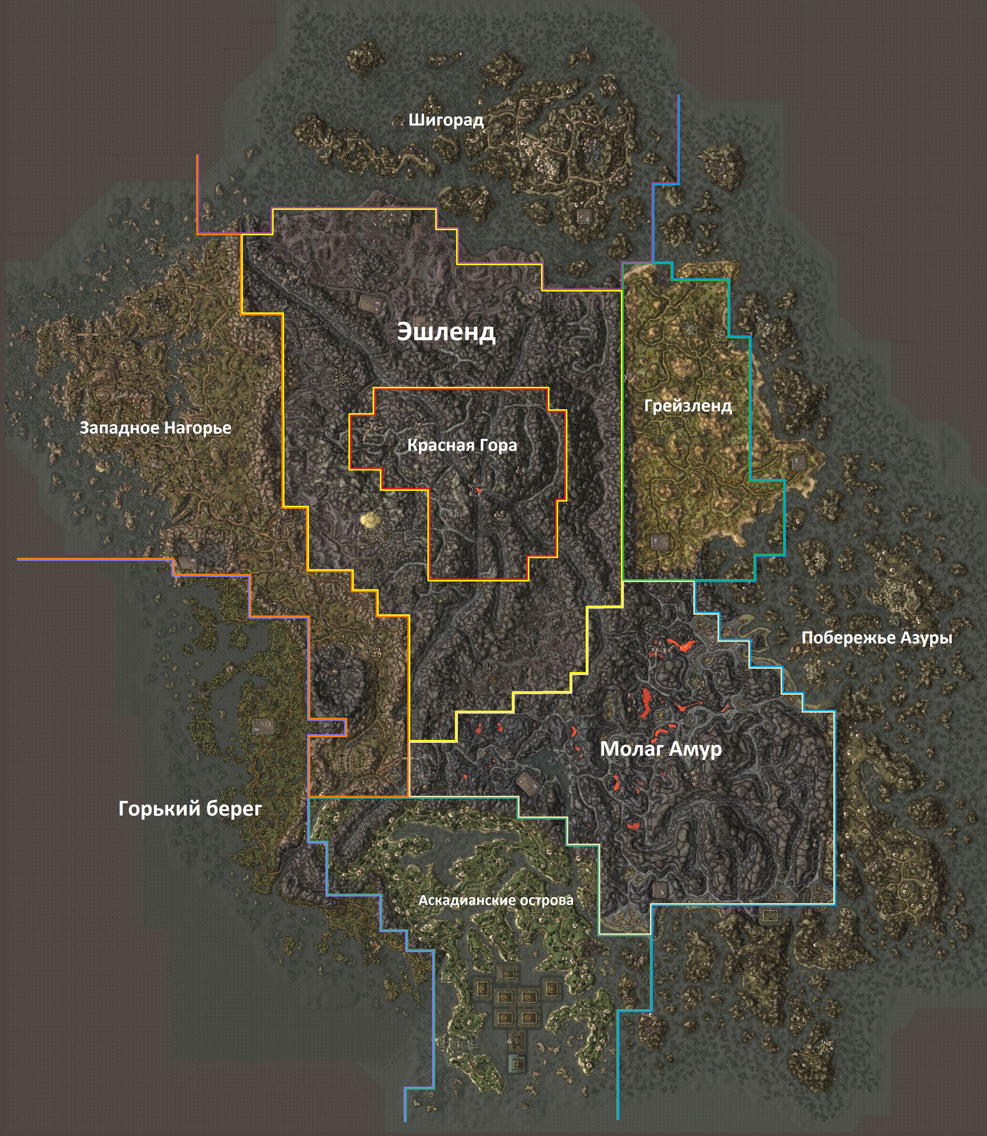 Аскадианские острова находятся в южной части острова Вварденфелл. Регион граничит с побережьем Азуры , Горьким берегом , Западным нагорьем и Молаг Амуром . Здесь расположены почти все озёра острова, такие как озеро Амайя , Хайран , Масоби . Омывается регион водами Внутреннего моря .