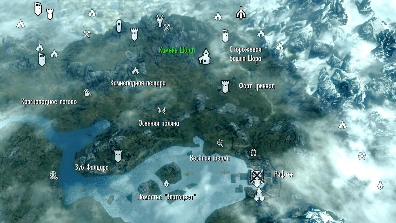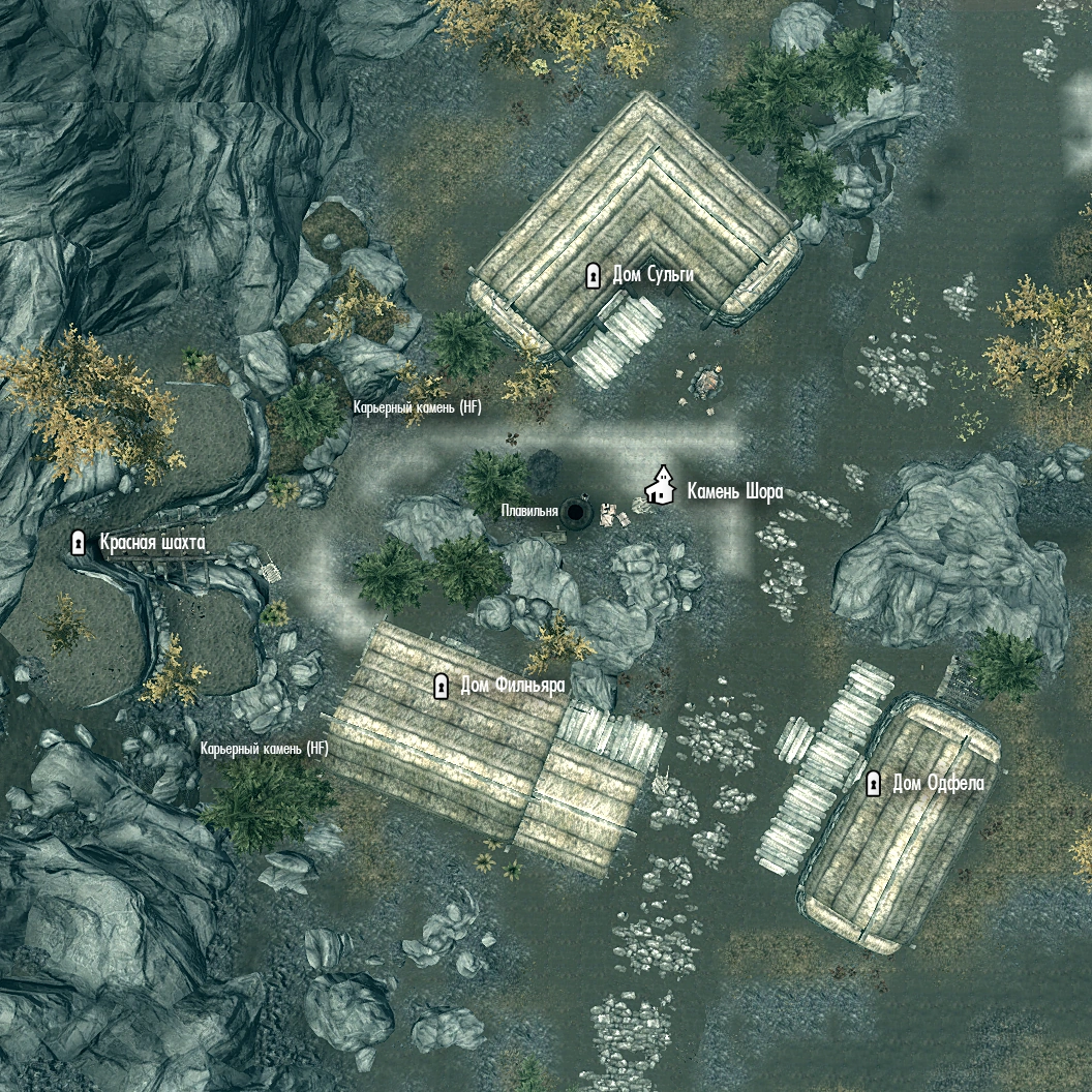 Если Довакин прибудет ночью, он может застать всех жителей поселения у огня, обсуждающими свои проблемы. Разговор с Филньяром начнёт квест по зачистке Красной шахты от пауков; если поговорить с Сульгой, то она попросит доставить сумку с письмами её отцу Вернеру в Чёрный Брод.