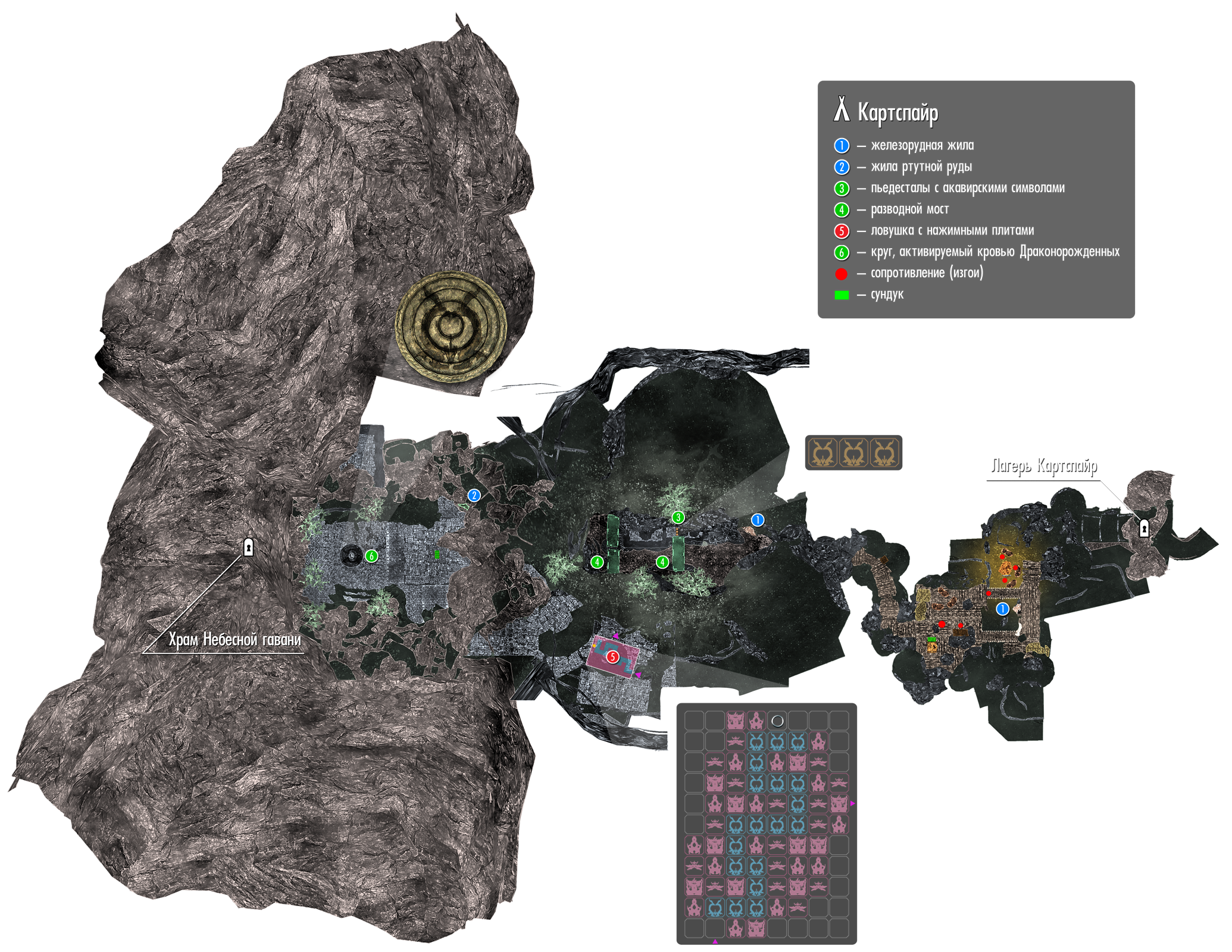 Поднявшись по ступеням, можно увидеть поднятый разводной мост. Чтобы его опустить, нужно выставить правильные символы на трёх вращающихся пьедесталах, расположенных сразу на вершине лестницы. Из трёх возможных акавирских символов нужно выбрать символ Драконорождённого на каждом из трёх пьедесталов (см. иллюстрацию). Как только нужная комбинация будет выставлена, мост опустится, и можно будет перебраться на другой край колодца, где находится ещё один узкий проход, выводящий в маленькую комнату-ловушку. Её пол сплошь состоит из нажимных пластин с изображением акавирских символов. Чтобы пройти через эту комнату, необходимо пересечь её, следуя по пластинам, отмеченным всё тем же символом Драконорождённого, и активировать кольцо на каменном пьедестале (см. иллюстрацию). Это отключит все ловушки в комнате, давая возможность преодолеть её и компаньонам Довакина, а также опустит ещё один разводной мост, находящийся на следующем уровне колодца сразу после выхода из комнаты-ловушки.
