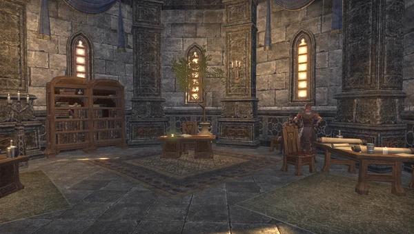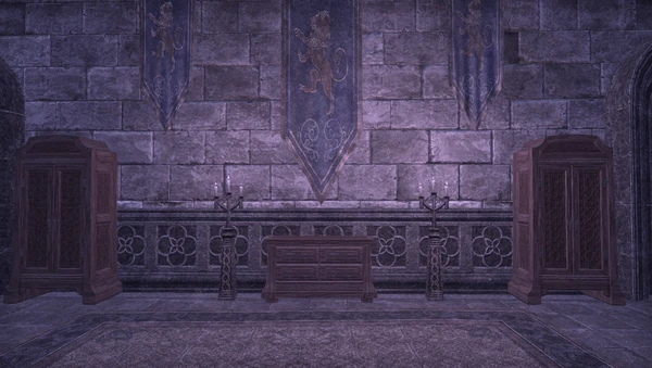 Вход ведёт в вестибюль, в котором висят синие знамёна со львами и стоят два массивных шкафа, между которыми — комод. Слева у стены находятся книжный шкаф и пара скамеек, а справа — скамья и урна. За разделительной стеной находится главный зал, разделённых на три зоны: столовую, кухню и тронное помещение. Первая зона главного зала находится в его левой части и занята большим обеденным столом. Вдоль стен здесь стоят шкафы с посудой, а также скамья со спинкой и пара урн. Кухня представляет собой огороженное деревянными ширмами пространство, внутри которого стоят стойки для готовки, бочки и ящики с припасами. Тронный зал представляет собой ограждённый колоннадой помещение с высоким потолком, на возвышении в дальней части которого установлены троны герцогов Алькаира. Слева к главному залу примыкает небольшое помещение, заставленное книжными шкафами и тремя письменными столами, а справа — лестница в библиотеку и на второй этаж.