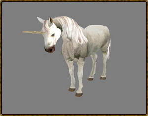 Уникальное создание, появляющееся в квесте Принца Даэдра Хирсина. Если во время выполнения квеста не испугать его и не попасться на глаза его стражам, то можно подобраться и оседлать животное. Правда, единорог вернётся на своё пастбище, если с него спешиться. |