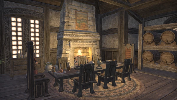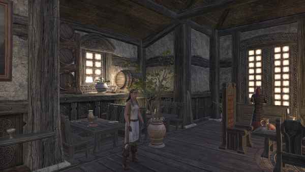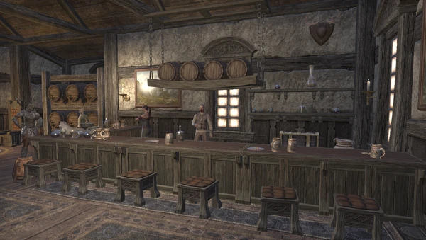 Вдоль стены слева от входа находятся две стойки-бара для посетителей, у которых находится несколько обитых тканью пуфов. Рядом стоит имперец по имени Пий Гельвий, который может стать потенциальным работодателем для семьи Ваносов, равно как и Ания Латер, находящаяся неподалёку. В пристройке слева стоят два обеденных стола и скамьи. У стены напротив входа находятся комод и камин, в котором всегда поддерживается огонь. Перед ним стоит большой обеденный стол на восемь персон. Рядом находится Алессио Гийон, который расскажет герою о попавших в беду оракулах Азуры. В пристройке справа установлена подставка для бочек.