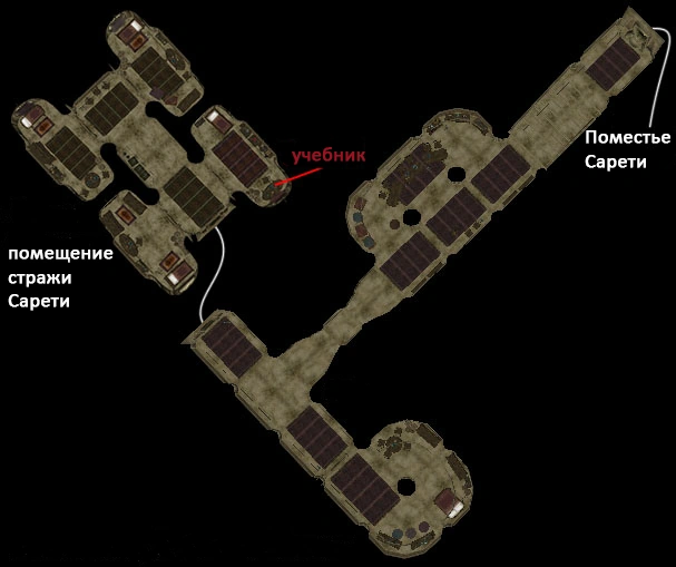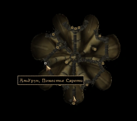 Поместье относительно небольшое, в нём всего две зоны: «Поместье Сарети» и «Помещение стражи Сарети». В помещениях везде на полах расстелены ковры. От входа видно длинный коридор, слева у стены стоят кресла. Справа имеется большая ниша, превращённая в столовую. Тут стоят комоды и шкафы с посудой, есть столы, к которым пододвинуты кресла. В дальнем конце коридора имеется две двери: дверь слева заперта и ведёт в спальню хозяев, правая же дверь открывается в помещения стражи. В спальне поставлена широкая кровать, два шкафа с одеждой и стол с креслами.