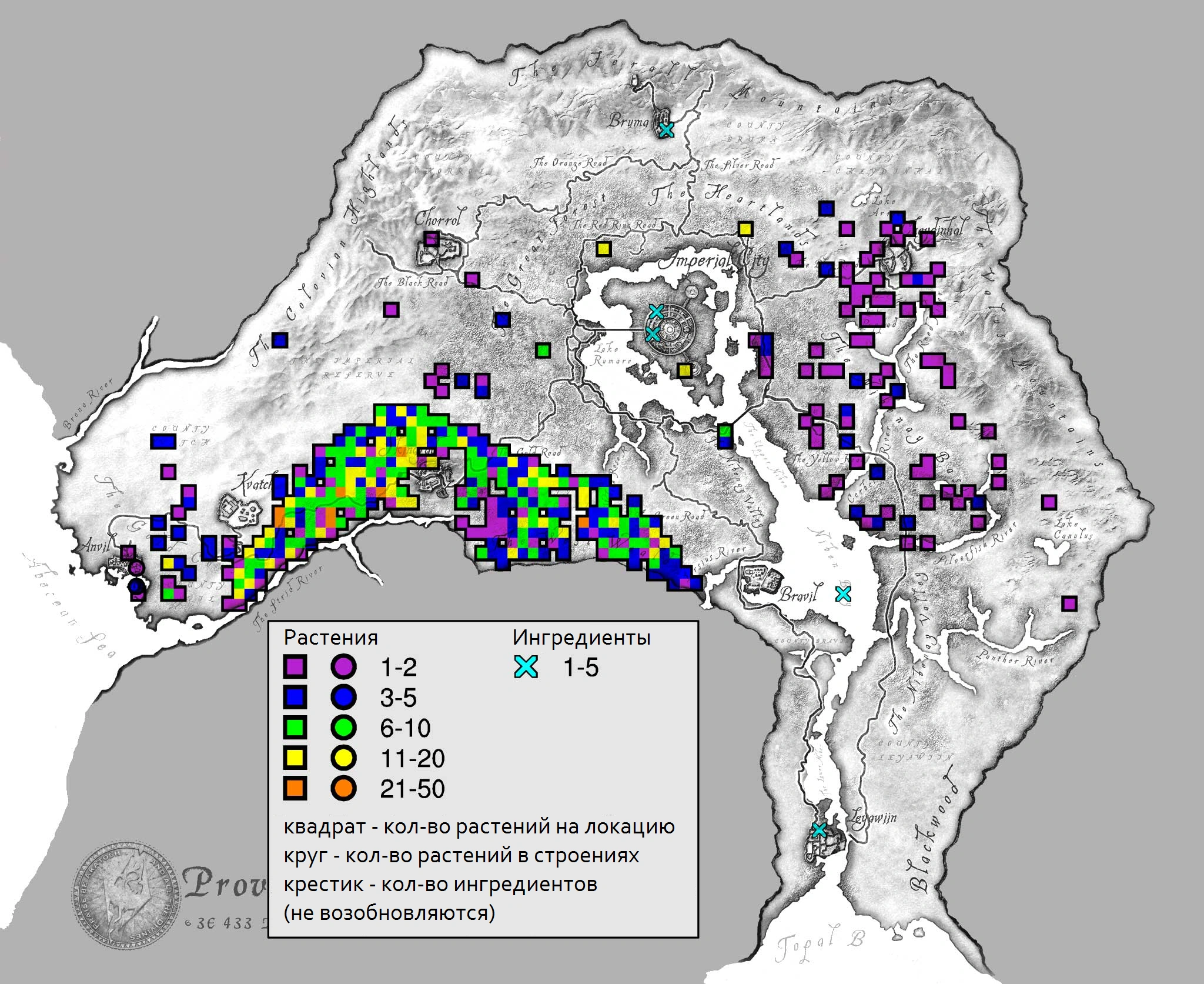 Всего в игре 8 ингредиентов и 2430 растений (2362 в Тамриэле, 61 в Раю Манкара Каморана и 7 в строениях).