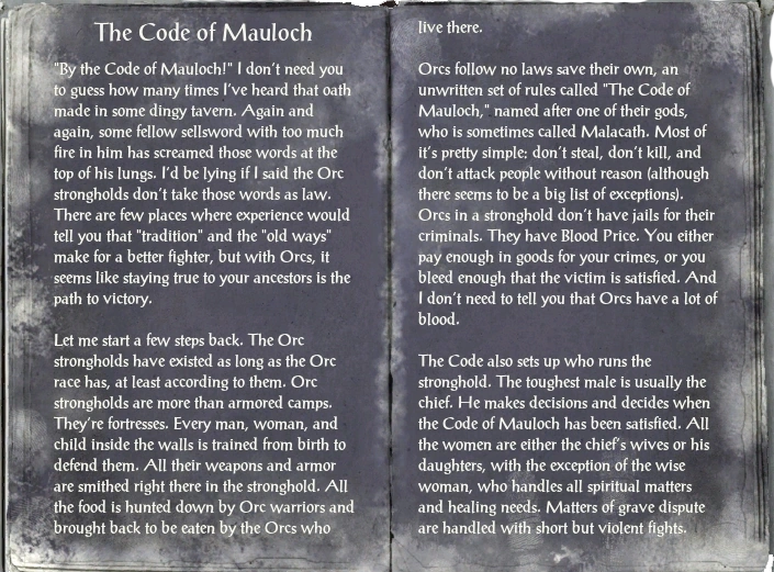 “Клянусь Кодексом Малоха!” не буду згадувати, скільки разів я чув цей вигук в якій небудь брудній таверні. Знову і знову, якийсь хлопака з мечем і вогнем азарту в очах викрикує ці слова надриваючи горло. Я б збрехав сказавши, що у фортецях орків не приймають ці слова серйозно. З досвіду я скажу, що “традиції” та “старі шляхи” не роблять бійця кращим. Але орки вважають, що залишатися вірним предкам це прямий шлях до перемоги.