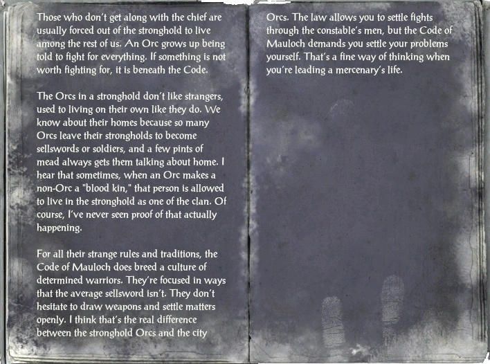 Орки звикли жити самостійно, і в своїх фортецях вони не люблять чужинців.Ми знаємо так багато про ці фортеці лише тому, що дуже багато орків покинули домівку, щоб стати найманцем чи солдатом, а кілька кухлів меду завжди примушують їх говорити про дім. Я чув, що іноді, орк приймає не-орка до “кровної родини”. Такій людині дозволяється жити в фортеці, як члену орчого клану. Звісно, я ніколи не бачив підтвердження такої події.