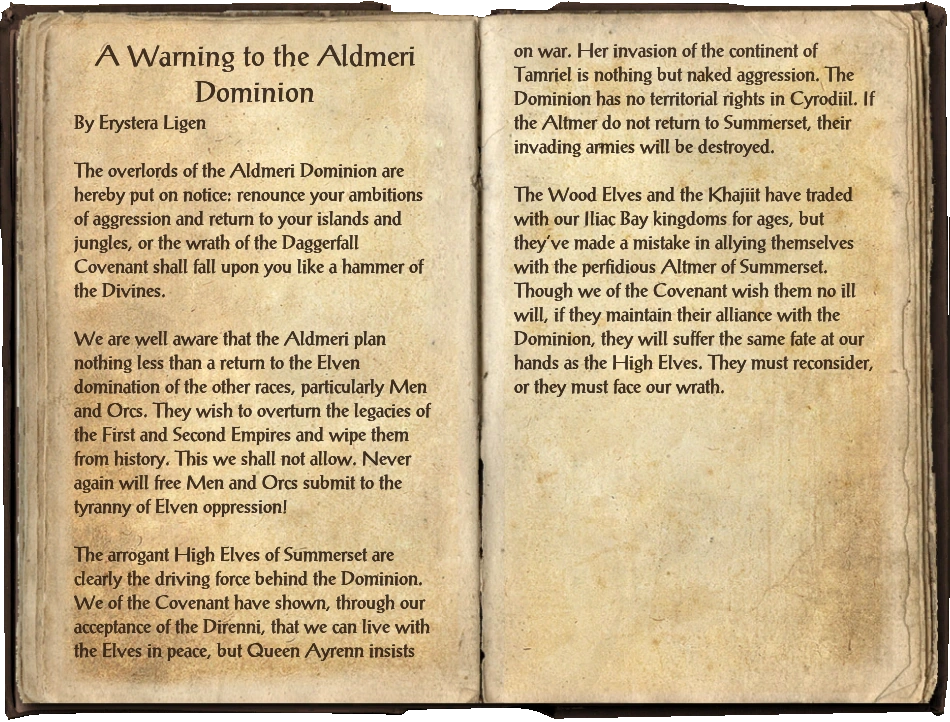 The overlords of the Aldmeri Dominion are hereby put on notice: renounce your ambitions of aggression and return to your islands and jungles, or the wrath of the Daggerfall Covenant shall fall upon you like a hammer of the Divines.