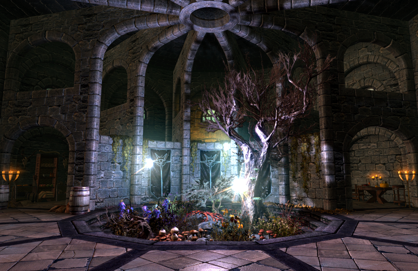 Accessed through the staircase directly on the left upon entering the Hall of the Elements, the Arch-Mage's Quarters opens into a hall lined with bookcases. It also leads into The Arcanaeum and the top of the College of Winterhold. The hall bends to the right, opening into a circular room with an alchemy garden in the center. Here, potion ingredients can be collected, similar to the courtyard of the Arcane University and the garden in the Poisoner's Nook in the Dawnstar Sanctuary. Around the perimeter of the room resides a bed, an Arcane Enchanter, an Alchemy Lab, and several storage devices, including a safe.
