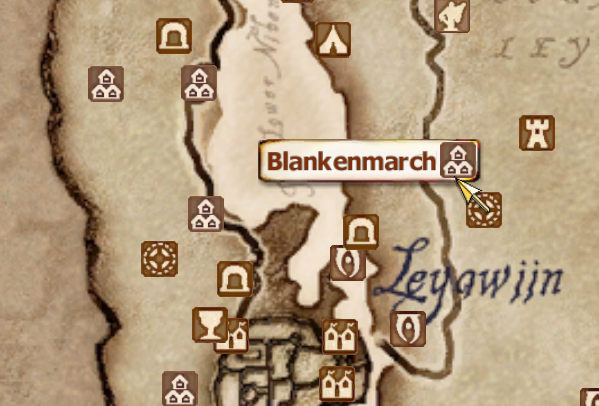Blankenmarch is a small settlement along the Yellow Road north and east of Leyawiin. Nearly adjacent to Veyond, the settlement is just northeast of the Amelion Tomb. Residents include Hanz gro-Hubrag, Floyd Nathans, and Philip Franc.