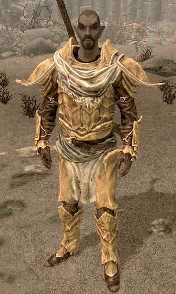 - What's the unusual armor you're wearing? "Ah, this is bonemold armor... quite impressive, wouldn't you say? It's fashioned from actual bone that's been reinforced with a resin-like material and then shaped to form the armored plating. It might appear brittle, but I'd wager it could stop the blow of a weapon better than iron or steel."