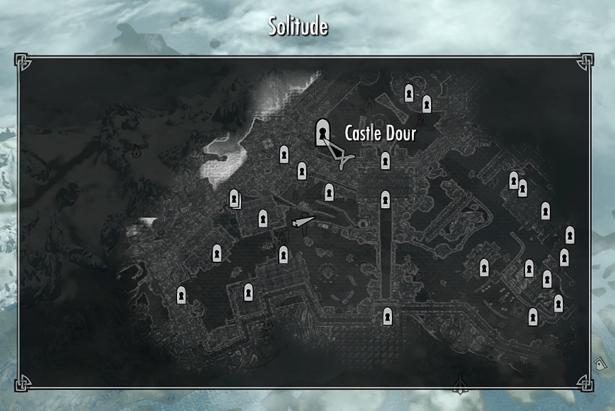 Castle Dour is an Imperial Legion outpost in The Elder Scrolls V: Skyrim that functions in Solitude during the civil war. General Tullius resides within, along with his second in command, Legate Rikke. Together, they command the Imperial forces in Skyrim. It is also home to the barracks for the Solitude hold guards and various Imperial legionnaires.