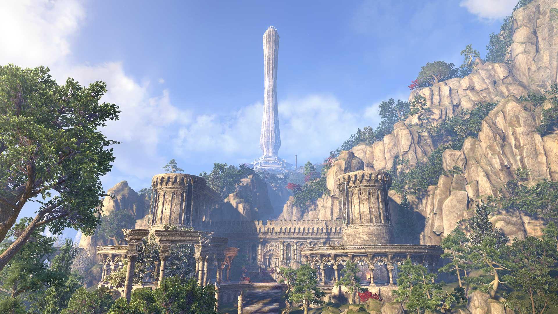 The Crystal Tower is situated on the northern end of the Isle of Summerset, overlooking the Abecean Sea and the rest of the land. The nearest settlement to the Tower is the city-state of Cloudrest. The Crystal Tower is exceptionally large with a slender build, being able to see the southern tip of the Dragon's Teeth Mountains in Valenwood, which extends all the way to Skyrim. The halls are reflecting white, with light radiating throughout the windows. Along the halls are fountains with water flowing through it. The Crystal Tower holds various private collections and treasury, filled with relics of the past. Around the area is a large forest.