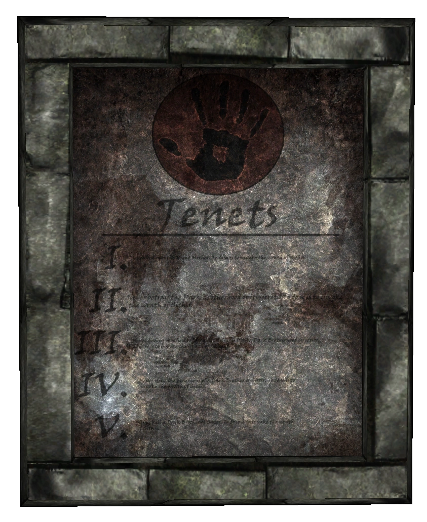 The Five Tenets are the rules and morals the Brotherhood followed up to and during the Oblivion Crisis. If a member broke or neglected to follow one of the Tenets, they were threatened with expulsion from the Brotherhood or worse.[29]