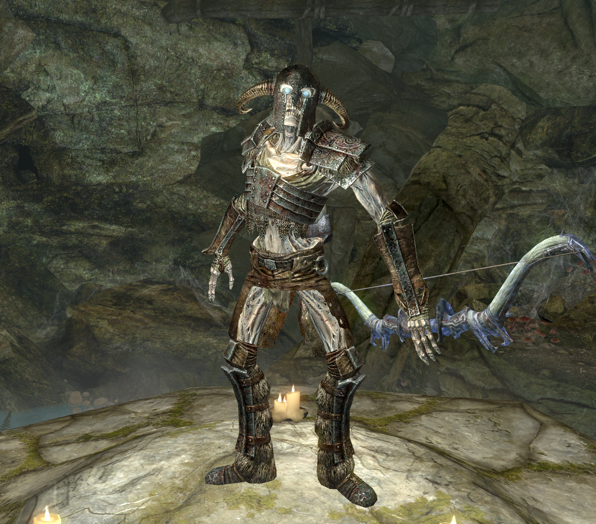 If one of the clones is attacked, it will dissipate after one hit; after both clones have died, Sigdis will teleport away again. It is possible to tell Sigdis apart from his clones because he is the only one with the true health amount (the clones will have full health), and also by the fact that his clones will be surrounded by a bluish glow. In addition, the "real" Sigdis can be identified by being the only one wearing an Ancient Nord Helmet. His helm's decorative horns curl downwards; the horns on his clones' helmets will be curled upward, akin to the Helm of Yngol. Sigdis also carries the Gauldur Blackbow. After he has been killed, the Gauldur Amulet Fragment can be looted from his corpse. Exit through the cave behind Sigdis's coffin.