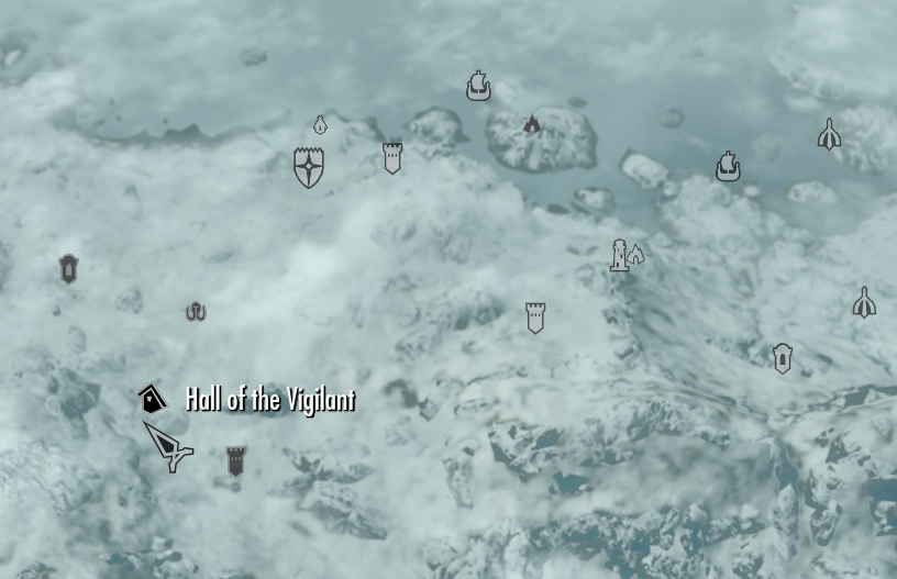 This isolated building is located south of Red Road Pass which is south of Dawnstar. It serves as a home for the Vigilants of Stendarr and their leader, Keeper Carcette. It is also not far from Dimhollow Crypt, which is up a small pathway to the west. Inside, the Hall looks like a cross between an inn and a small place of worship.