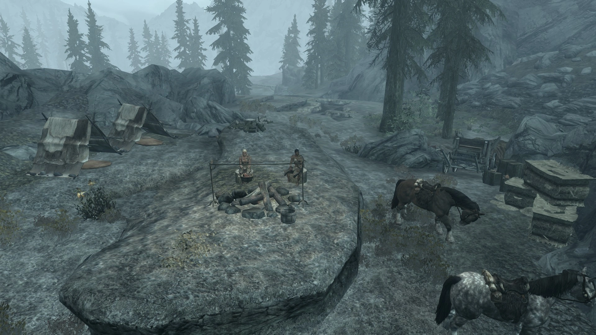 This is a very large hunter's camp complete with two horses, a wagon, and several hunters. There is a dead mammoth being butchered. There is also a corundum ore vein just to the south. The hunters have nothing to say outside of bartering or trading; they have the normal items associated with hunting camps. The hunters will become hostile if anything is stolen from their camp.