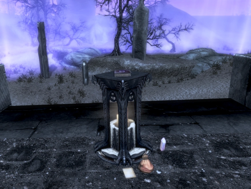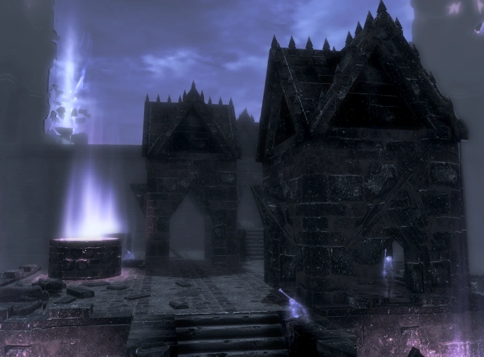 | Page 6 | Page 6 is nearby the stairs the Dragonborn descended on entering the Soul Cairn. Upon coming down them, look for the second building on the right (see Page 8) — the page is located in there next to a chest just inside the doorway on the right side. There is a Boneman waiting for you at the chest. This building is easiest to find by sticking to the path: it forks away to the right near the two souls sitting on the ruined walls. |