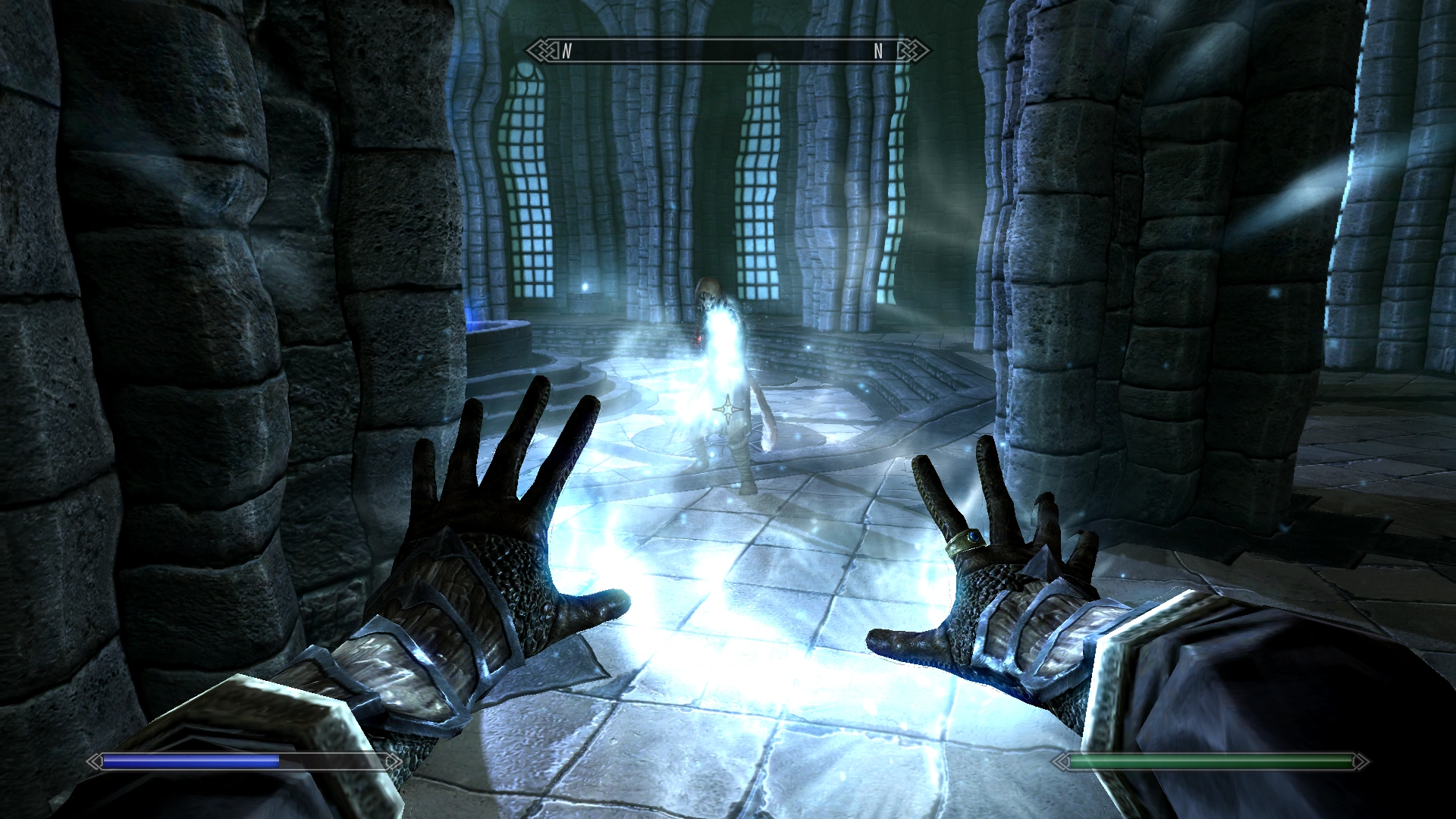 While in prolonged combat, he may run out of magicka and will use his fists regardless of any weapon or shield the Dragonborn gave him. While he does equip such items, dual-cast Sparks is equipped as soon as a combat is started. When he regenerates magicka after fist fighting for a few seconds, he will start casting fireball spells. At a long distance in the open, he will use Ice Spikes as his preferred spell.
