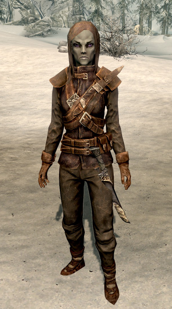 Karliah is the only Dunmer in the game whose eyes are violet. Her armor is a lighter shade of gray than the Guild Master's Armor Set and has the same brown-colored straps and satchels of the Thieves Guild Armor. Parts of it can appear purplish in some light, and it also appears to have a unique dagger strapped to the left shoulder, though it is for aesthetic purposes.