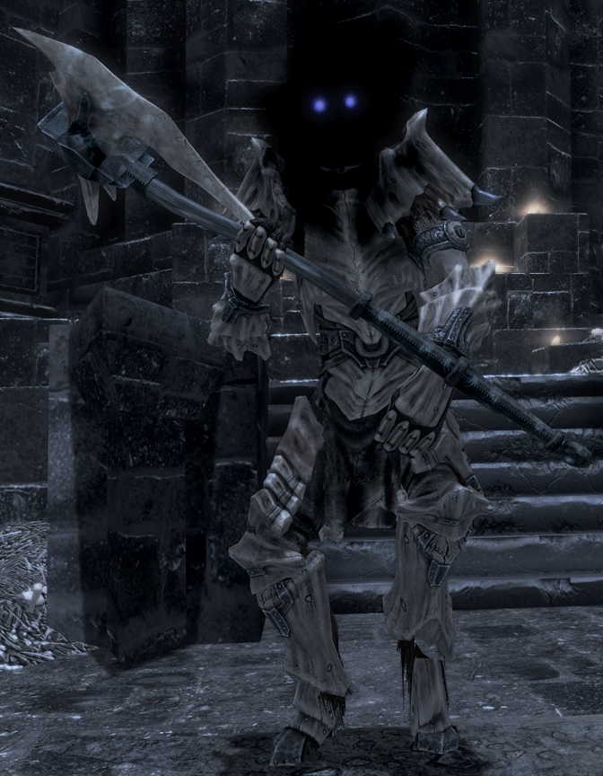 They are much taller than the Dragonborn and wear sets of dragonplate armor, minus the helm. They have no heads, save for a pair of glowing blue eyes set within a cloud of black smoke. They wield different types of dragonbone weapons (mace, battleaxe or bow with arrows).