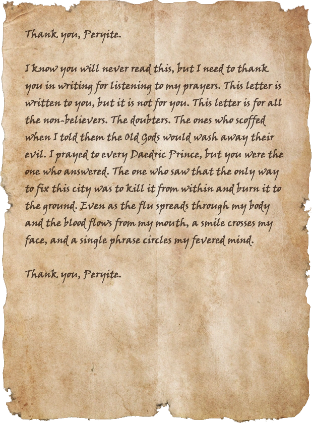 I know you will never read this, but I need to thank you in writing for listening to my prayers. This letter is written to you, but it is not for you. This letter is for all the non-believers. The doubters. The ones who scoffed when I told them the Old Gods would wash away their evil. I prayed to every Daedric Prince, but you were the one who answered. The one who saw that the only way to fix this city was to kill it from within and burn it to the ground. Even as the flu spreads through my body and the blood flows from my mouth, a smile crosses my face, and a single phrase circles my fevered mind.