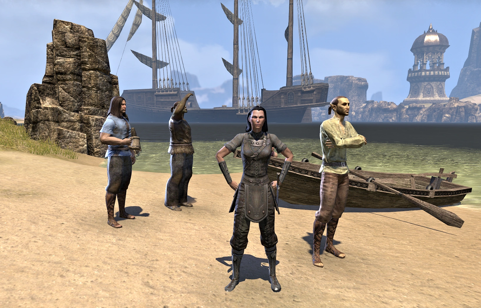Follow the marker to find the monkey and Lerisa will sneak up from behind. She explains her crew and that she will not leave without them. Help her and she will owe them a favor. The plan is to disguise themselves into Sea Drakes and look for a portly Breton, a sour Redguard, and a large Orc. Once they are out, meet Lerisa by Helane's ship. Watch out for Sea Drakes with torches; they will alert the others if spotted.