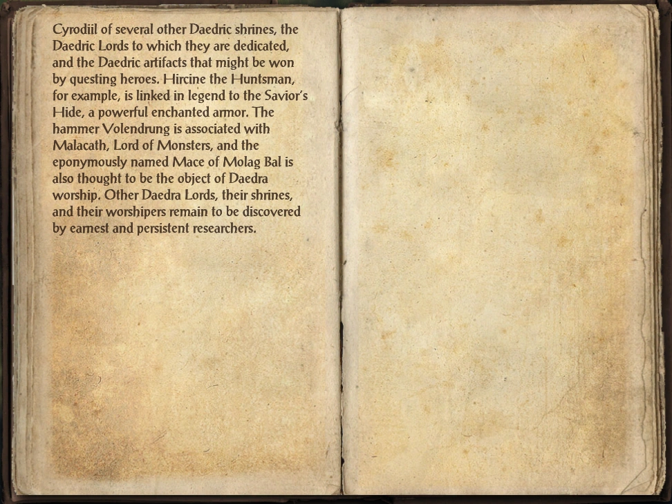 I have since heard rumors of the existence in Cyrodiil of several other Daedric shrines, of the Daedric Lords to which they are dedicated, and the Daedric artifacts that might be won by questing heroes. Hircine the Huntsman, for example, is linked in legend to the Cuirass of the Savior's Hide, a powerful enchanted armor. The sword Volendrung is associated with Malacath, Lord of Monsters, and the eponymously named Mace of Molag Bal is also thought to be the object of Daedra worship. Other Daedra Lords, their shrines and worshippers, remain to be discovered in Cyrodiil by earnest and persistent researchers.