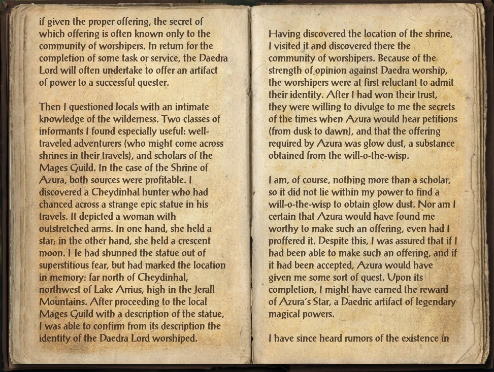 I personally have discovered one community worshipping the Daedra Lord Azura, Queen of Dawn and Dusk. A researcher curious about Daedra worship might research in several ways: through a study of the literature, through exploration and discovery of ancient daedric shrines, through questioning local informants, and through questioning worshippers themselves. I used all these means to discover the shrine of Azura.