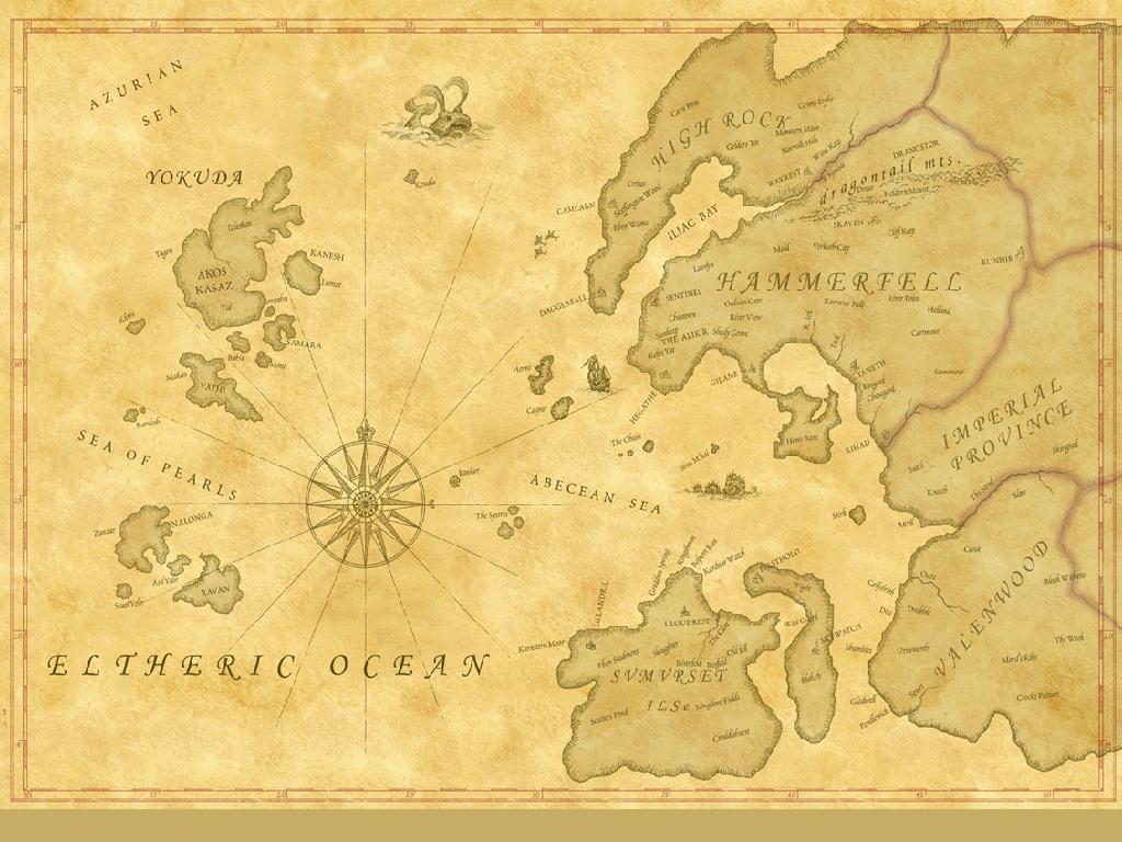 The planet has a notably large continent, Tamriel, which is where all of The Elder Scrolls activity takes place, with another similarly large continent to the east, named Akavir. The land masses are separated by the Padomaic Ocean, a massive saline body of water.