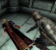 Baurus searches Uriel Septim VII's corpse for the Amulet of Kings.
