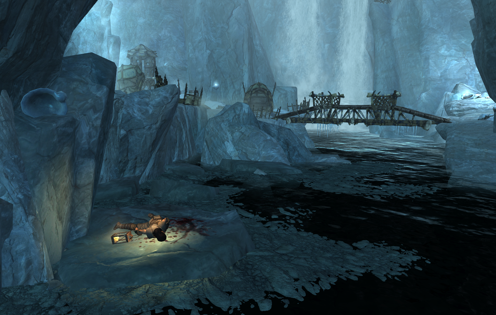 Upon entering the caverns, the path proceeds west next to a small stream. It then turns left (south), where the floor ends and ice-filled water begins. There are several rieklings present in the area. On the left (east) side is an ice shelf with the corpse of Esmond Tyne. It can be looted for the Bonemold Formula. Reading the note grants the ability to forge Improved Bonemold Armor at a forge. Upon returning to Glover Mallory, he will give the Dragonborn the key to his house, which grants access to the Blackguard's Armor set.