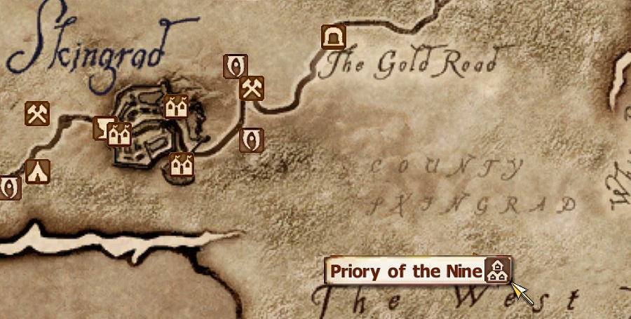 The Priory of the Nine is a small settlement located in the West Weald, near the Elsweyr border. The Priory houses the once-great Knights of the Nine.
