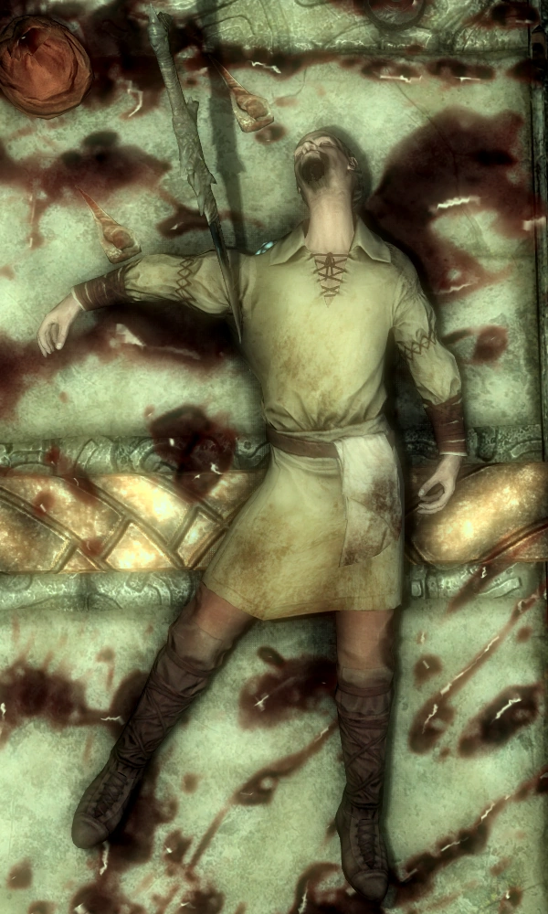He evidently went down fighting, as evidenced by the presence of a dead Chaurus in the final room of Liar's Retreat. This is somewhat surprising, as he is only level 1, at which point in the game the insects are quite deadly.
