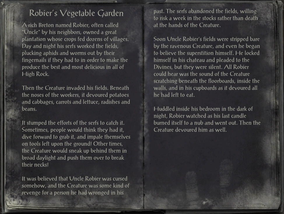 A rich Breton named Robier, often called "Uncle" by his neighbors, owned a great plantation whose crops fed dozens of villages. Day and night his serfs worked the fields, plucking aphids and worms out by their fingernails if they had to in order to make the produce the best and most delicious in all of High Rock.