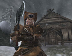Upon the completion of the Ristaag, the Nerevarine would be taken away by werewolves to participate in the Hunter's Game. Here, the Imperial Captain Falx Carius, the Frost Giant Karstaag, and Tharsten Heart-Fang were all encountered.[47] Falx Carius and the Nerevarine collaborated to fight against the first level of werewolves, though Falx would leave the Nerevarine to continue on to the second level, as he would ensure no werewolves would follow.[48] Tharsten would be found on the second level, however, the leader of the Skaal turned out to be the Champion of Hircine for many generations, and had been granted eternal life through Hircine's Ring.[49] The Nerevarine would defeat Karstaag and one of the three aspects of the Hunt, effectively ending the Bloodmoon Prophecy,[47] resulting in the werewolves dwindling in numbers, the fire in Lake Fjalding ceasing to burn, and the return of the Horkers. The Nerevarine was suspected to have been a potentially good replacement for Heart-Fang, however, because they were not Skaal-born they could not lead the village. Because of this, Korst Wind-Eye, the shaman, would guide the Skaal until the All-Maker appointed a new leader.[25]