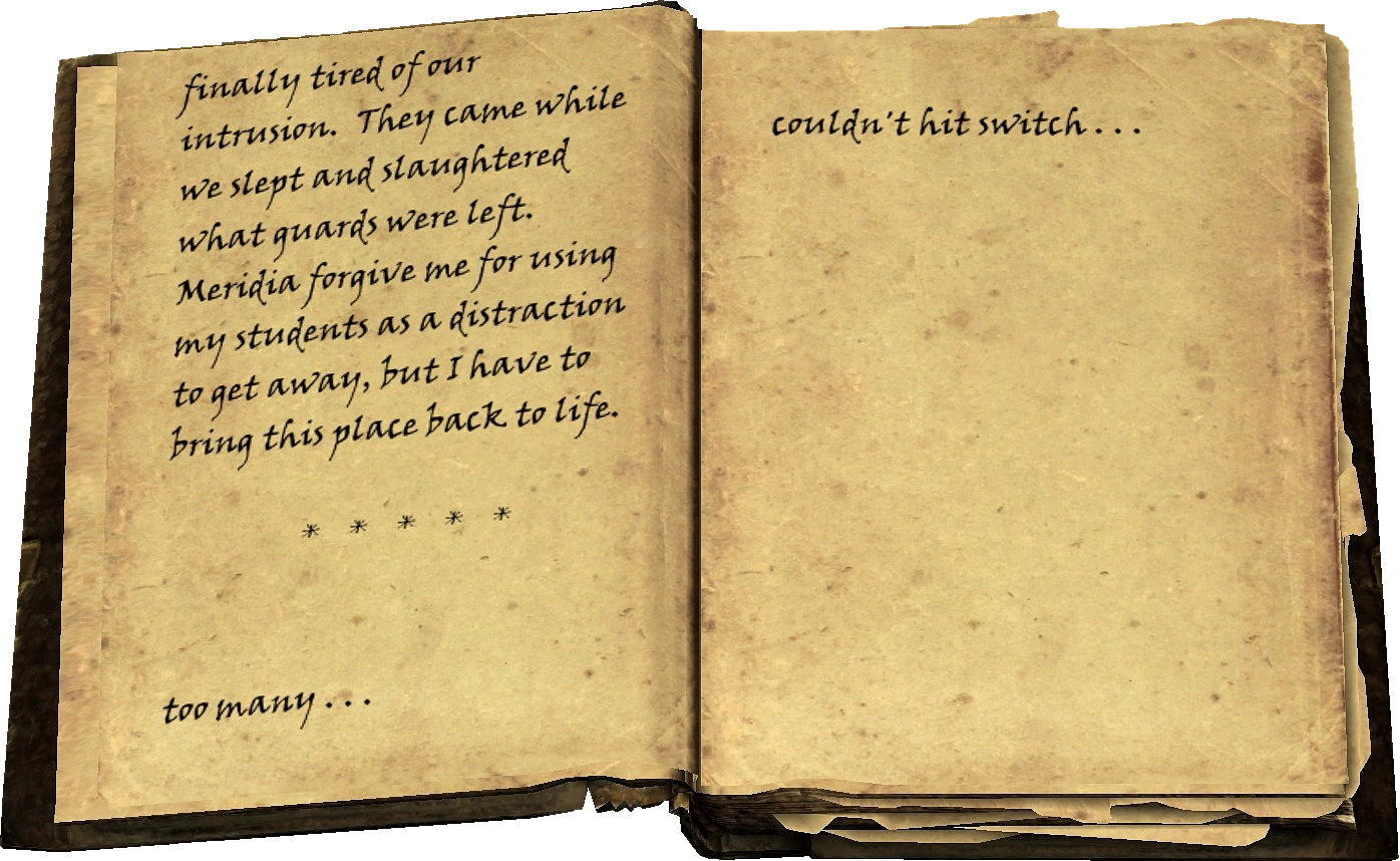 This book was taken from The Elder Scrolls series of video games or from websites created and owned by Bethesda Softworks, the copyright of which is held by Bethesda Softworks. All trademarks and registered trademarks present in the image are proprietary to Bethesda Softworks, the inclusion of which implies no affiliation with The Elder Scrolls Wiki. The use of such images is believed to fall under the fair use doctrine of copyright law.