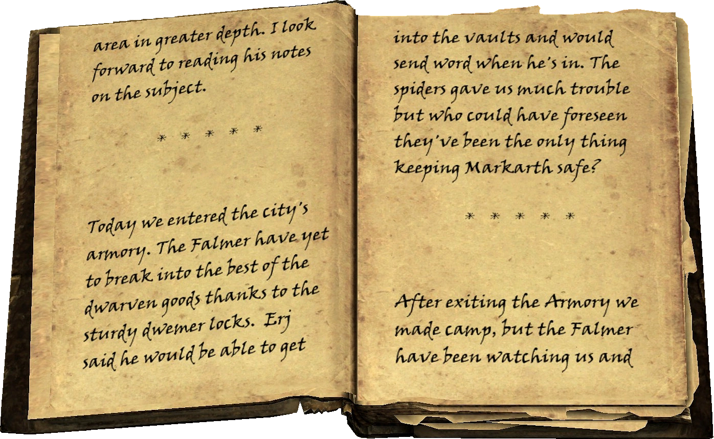 Today we entered the city's armory. The Falmer have yet to break into the best of the dwarven goods thanks to the sturdy dwemer locks. Erj said he would be able to get into the vaults and would send word when he's in. The spiders gave us much trouble but who could have foreseen they've been the only thing keeping Markarth safe?