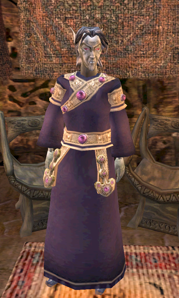 Neloth asks the Nerevarine to obtain the Robe of the Drake's Pride from Senise Thindo by any means necessary.