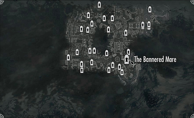 The Bannered Mare, serving as Whiterun's most popular gathering place, functions as a tavern and inn in The Elder Scrolls V: Skyrim that offers mead, food and a warm, welcoming fire. Almost anyone can be found in the tavern after the shops and stalls close. Its sign is that of a horse carrying a banner.