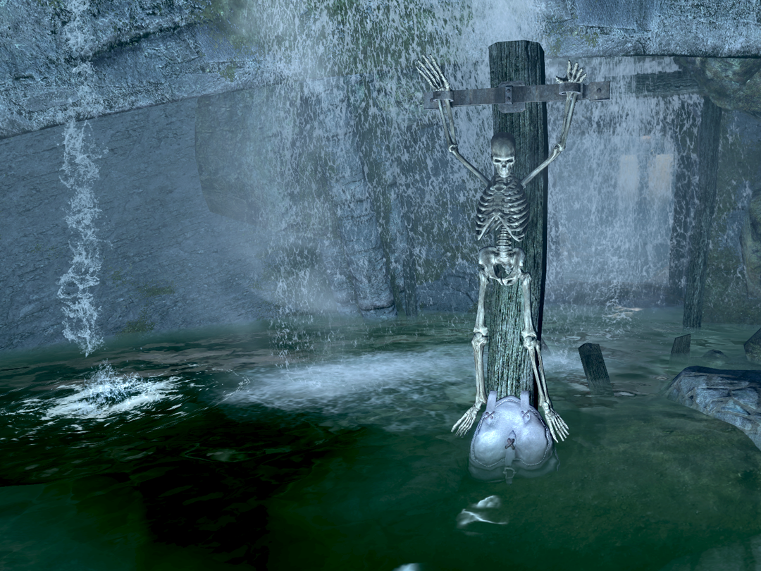 The door on the right leads to the next area, with a conjurer, a skeleton, and a dead wolf, which will be raised from the dead if the mage is alerted. The underwater passage behind the waterfall on the left leads to a hidden room with a chest and the Alteration skill book, Breathing Water, floating near the ceiling.