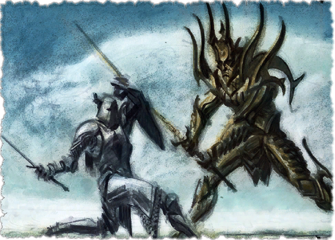 [And so after many battles with] Umaril's allies, where dead Aurorans lay like candlelight around the throne, the Pelinal became surrounded by the last Ayleid sorcerer-kings and their demons, each one heavy with varliance. The Whitestrake cracked the floor with his mace and they withdrew, and he said, "Bring me Umaril that called me out!" ... [And] while mighty in his aspect and wicked, deathless-golden Umaril favored ruin-from-afar over close combat and so he tarried in the shadows of the white tower before coming forth. More soldiers were sent against Pelinal to die, and yet they managed to pierce his armor with axes and arrows, for Umaril had wrought each one by long varliance, which he had been hoarding since his first issue [of challenge.]...