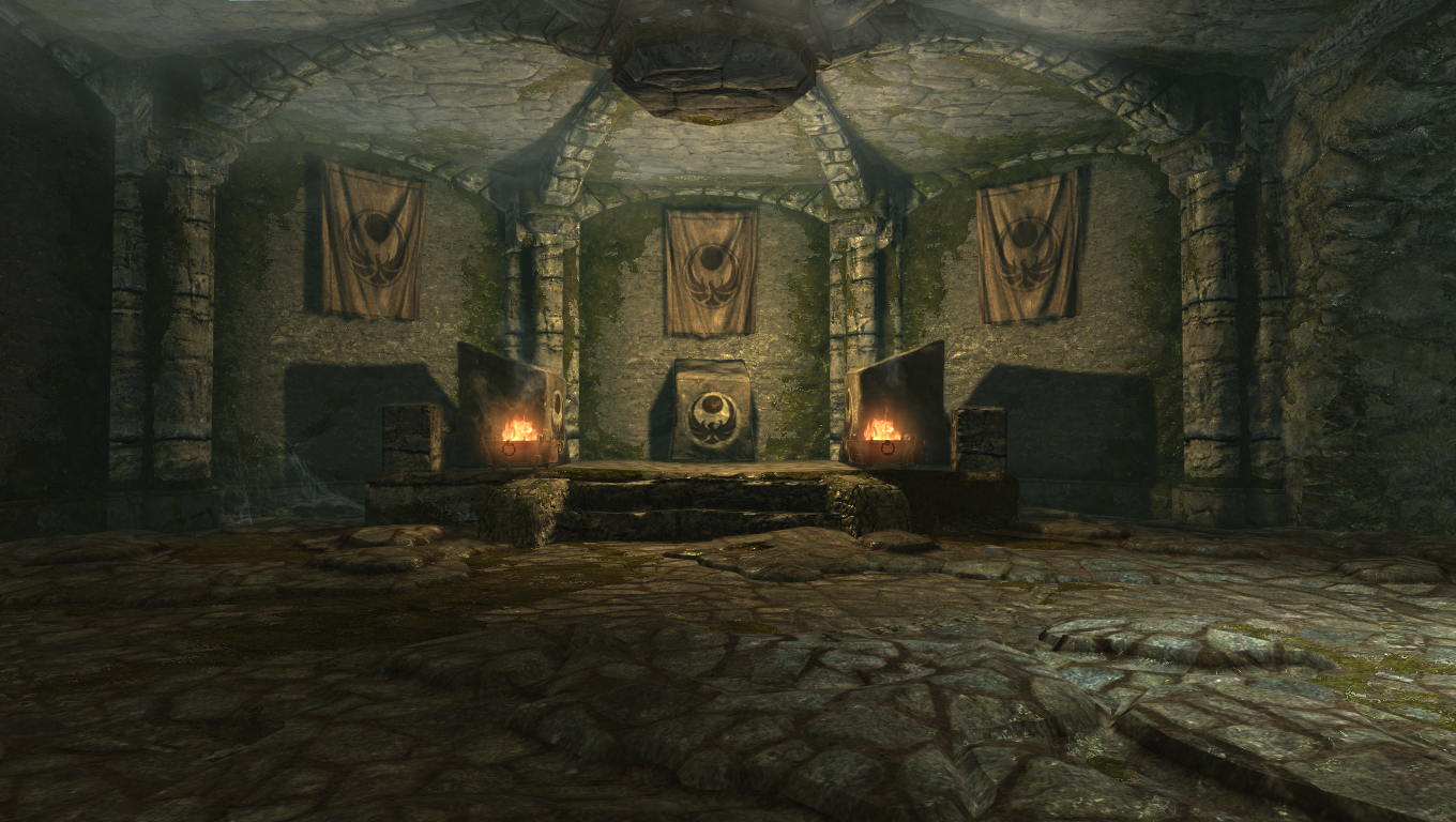 Karliah opens a gate into a room with three glyphs. All three characters take their place on one of the glyphs, and Karliah calls upon Nocturnal, who then appears. Karliah offers to have Brynjolf and the Dragonborn take the oath to serve Nocturnal in order to gain the strength to take down Mercer Frey. Nocturnal accepts the offer and the three characters become the new Nightingales.