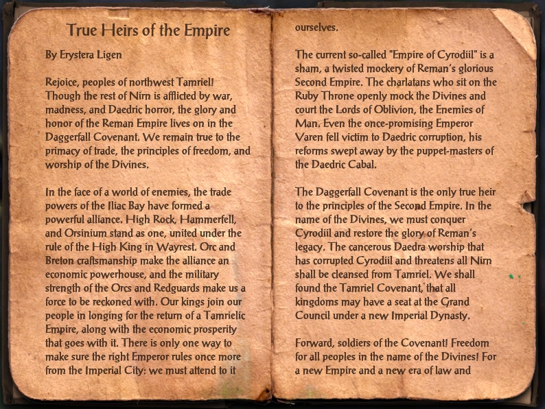 Rejoice, peoples of northwest Tamriel! Though the rest of Nirn is afflicted by war, madness, and Daedric horror, the glory and honor of the Reman Empire lives on in the Daggerfall Covenant. We remain true to the primacy of trade, the principles of freedom, and worship of the Divines.