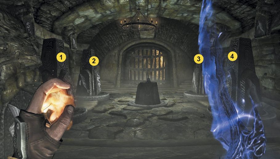After several more rooms and traps, there will be a door on the second floor near a broken coffin. Beyond there is a puzzle with six different movable pillars. The correct position for each pillar is shown on the wall directly behind and above them. This fact could easily be missed if the Dragonborn were not up close to the pillars. The Candlelight spell (or Night Eye) makes them easier to see. Once the pillars are properly set, the lever can be activated to open the gate.